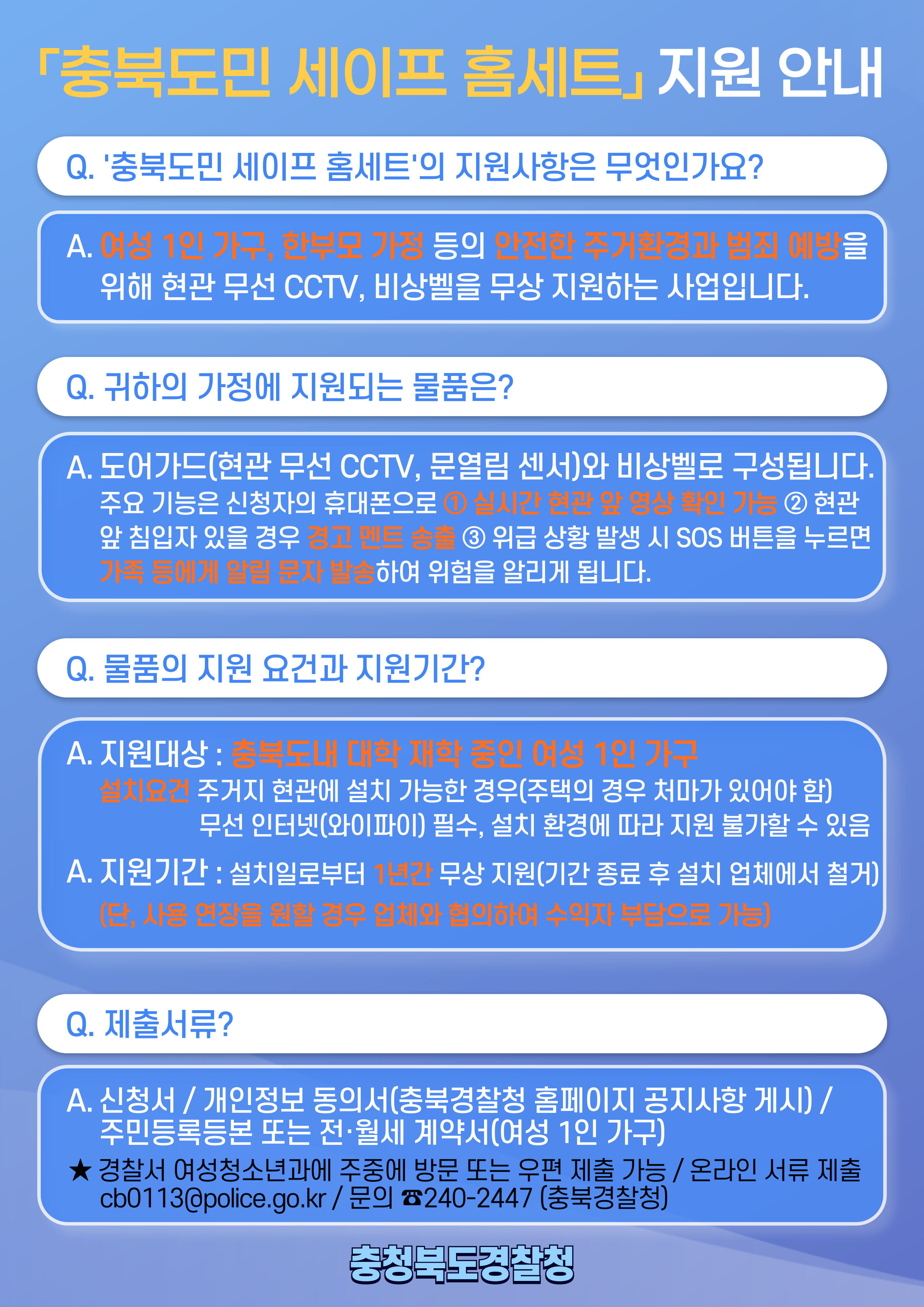 학생공지 학생공지 일반공지 장학/학자금 공지 감염병안내 공모/모집/시험 도서관 생활관 기부금공개 업무추진비공개 보육교원연수원 기타공고 충청대학교_대표-학생공지(대표_충청마당_공지사항_학생공지) 상세보기 - 제목, 내용, 파일, 작성자, 조회수, 작성일, 학과공지, 주소링크 정보 제공 [인권센터] 대학생 여성 1인 가구 대상 보안장비 무상지원 안내 작성자 : 이정민 작성일 : 2025-10-24 조회 : 118 도내 대학 재학 중인 여성 1인 가구 대상, 세이프안심홈세트 지원 안내입니다. 파일 jpg 문서 안심장비 세이프 홈세트 지원 안내문.jpg hwp 문서 서비스 이용 신청서 및 개인정보 수집이용 동의서(공통 ).hwp 주소링크 목록 게시물삭제 광고 반복작성 욕설 본인삭제 게시물삭제 이전글 【취업허브센터】 2025 모의면접 경진대회(11.19.(수)) 행사 안내 다음글 [노란화분] 해외 취업 사기 범죄 예방 안내